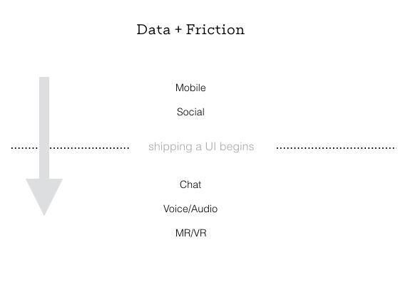 任何时候,只要收集数据的阻力减小,我们就可以在更短的时间内改善服务,以形成竞争优势。例如, Bubby 应用程序的创始人意识到,两个人是否分享了滑雪的兴趣和他们能否顺利交往之间存在相关性。再有,家人一起去度假,拥有相同的偏好能增强游玩的乐趣。然而问题在于程序只有在你提到滑雪爱好时才会记住你的偏好,不过具有聊天机器人属性的 Bubby 可以主动就滑雪爱好向用户提问并更新信息和推荐。想象一下,如果 Tinder 想要了解这个问题会怎么做?它必须改变移动应用程序中的 UI,引导用户进入自己的档案页面,指望用户依照路径找到可以回答这个问题的地方,如此繁琐的过程意味着数据量的流失。
