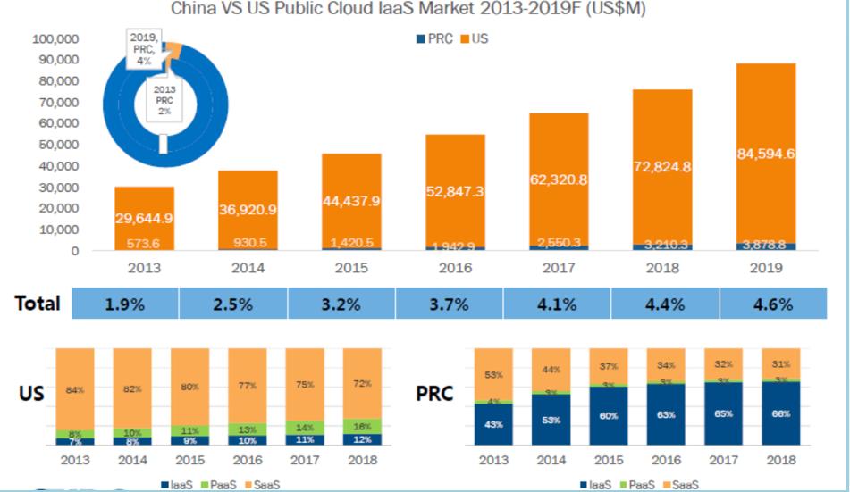 中国的云计算能力这个市场是非常广大的,潜力是无限的,因为我再分享一个数据,IDC在去年年底做了中国公有云市场的报告,中国公有云市场,包括SaaS、IaaS,所有的公有云的市场收入的总量只占美国同类收入总量的3%多。但