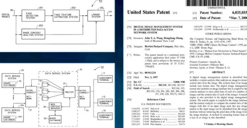 这件事情在AI的历史上走了几十年,以我的专利为证,这是我1997年在惠普实验室申请的专利,这个专利基本的核心是:当照片进来以后我做一个人脸检测、人脸特征的提取,从而进行比对,而且我20年前就已经预测到这个体系很难在一个体系上实现,而需要一个分布的体系,所以它是一个分布式的数据库系统,今天看来这个东西就是手机。