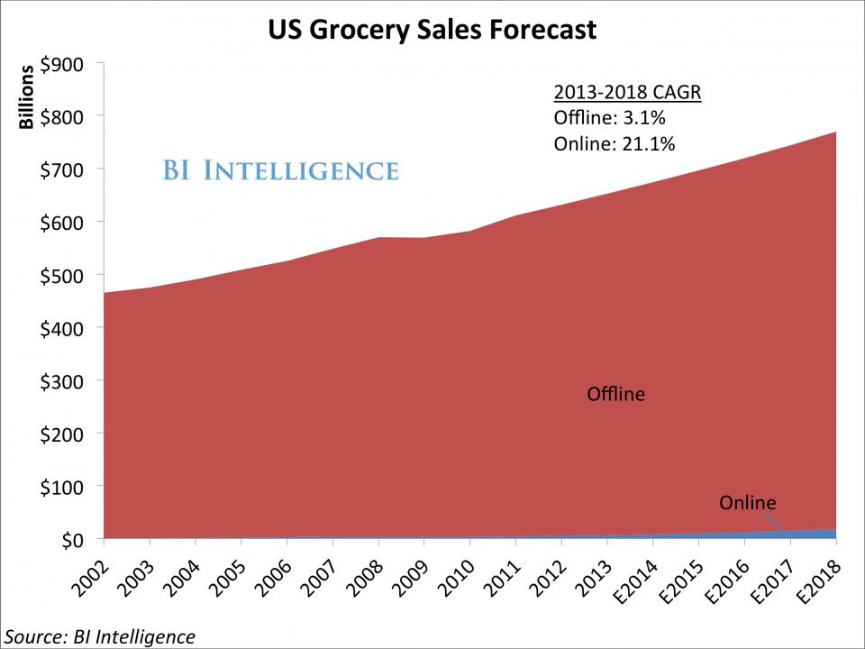 美国便利店的市场足够大也是亚马逊做出这个决定的重要原因之一。彭博曾在13年对美国的杂货店商品销售规模做出预测和测算(如下图所示),预计整个行业在2018年会到7000亿美元水平且几乎均在线下完成购买。