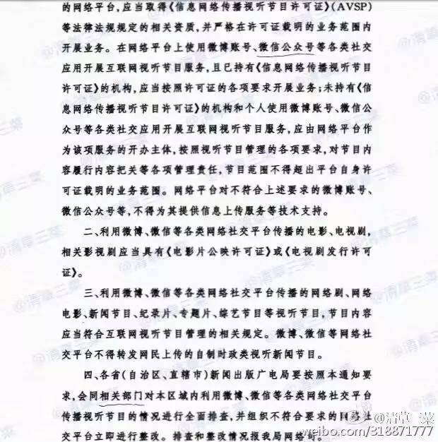 近日,有一则名为《国家新闻出版广电总局关于加强微博、微信等网络社交平台传播视听节目管理的通知》的文件截图在网上流传。