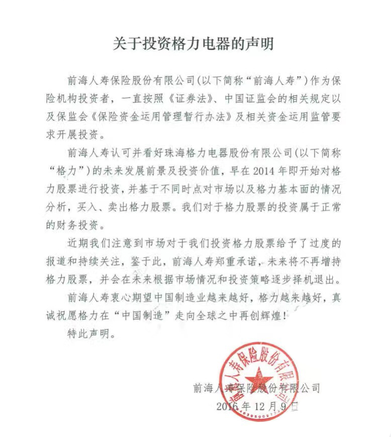 前海人寿还表示,对于格力股票的投资属于正常的财务投资: