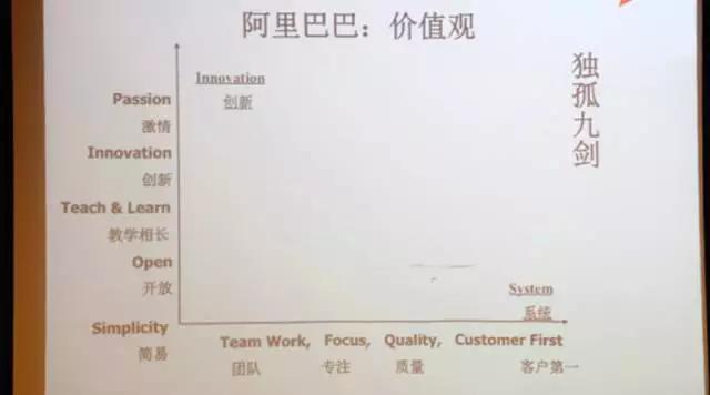 注:2001年1月13日,星期六,关明生就任阿里巴巴COO的第5天。他问马云:“阿里巴巴有很好的文化,有价值观、使命感。我们有没有把他写下来呢?”马云想了很久说,“从来没有。”当天,大家集思广益把从创业的所有感受、教训、血泪,都写在里面,整整贴了一面墙。从100多条筛选出了20多条,最后精简到9条,不能再减了。这就是阿里巴巴的独孤九剑:创新、激情、开放、教学相长、群策群力、质量、专注、服务与尊重、简易。