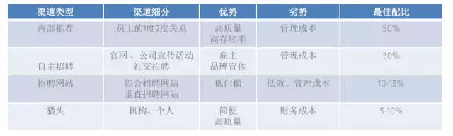 对于早期的个人团队,我比较推崇内部推荐这种方式。如果你目前团队的人有一半,甚至一半以上是通过内部推荐这种渠道的,你们团队对招聘的重视程度非常好,是HR理念非常好的一个组合。