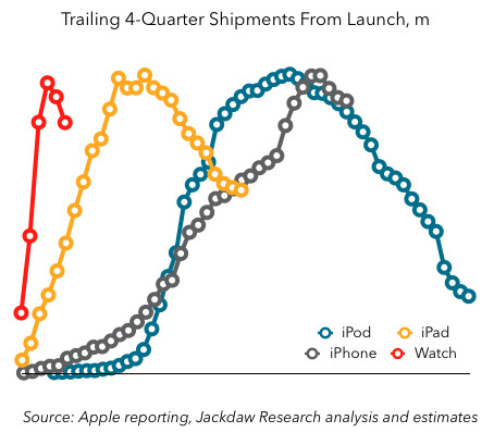 如你所见,每种情况下,曲线的形状各不相同。我还想让你注意到iPod和iPhone的曲线十分相似,iPad和Apple Watch的曲线在早期时间的联系及存在的不同之处。iPod 和iPhone在正式发布大约8-9年后到达了第一个真正的顶峰。与此相反,iPad大约在发布三年后达到定分,之后其销售量开始下降。而Apple Watch则是在上市一年后年发货量开始下降。换句话说,iPad比iPhone和 iPod的曲线形状更陡,Apple Watch的曲线一直比较陡峭。(我会在一分钟后提出一些警告,但现在请忍受我的说辞)