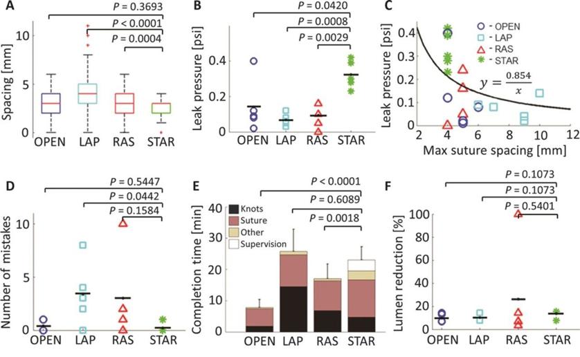 STAR是在执行开放性手术。 外科医生会立即理解这一点,并忽略LAP和RAS结果,因为这是不公平的。 他们在猪身上切了一个大洞,把肠子拉出去修复。 这是一个很重要的问题。与其相比,人类使用腹腔镜进行手术,这就像要求他们将一只手绑在背后。 开放性手术对患者的风险高得多。