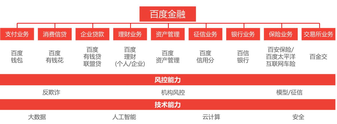 2016年百度世界大会上,百度金融就表示,想要成为一家真正意义的金融科技公司,利用人工智能等技术优势,升级传统金融,实现普惠金融的梦想,要发展“身份识别认证”、“大数据风控”、“智能投顾”、“量化投资”、“金融云”、“智能获客”六大金融科技方向,并向传统金融机构开放“金融云”,输出全套金融解决方案。