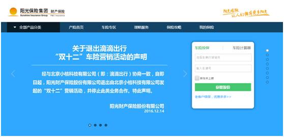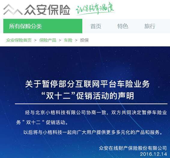 14日下午,阳光产险在官方网站发布声明,称退出滴滴出行“双12”车险营销活动,表示经与北京小桔科技有限公司(即滴滴出行)协商一致,自即日起,阳光财产保险股份有限公司退出由北京小桔科技有限公司发起的“双十二”营销活动,并停止此类业务合作。 众安保险也在官网发出了同样的公告。
