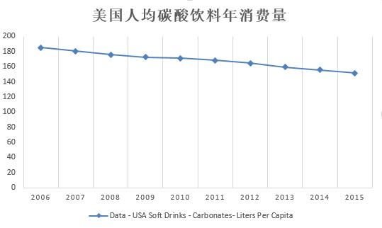 而且,彭博数据显示,美国碳酸饮料人均年消费,已经从十年前的185升,逐年下降到了2015年的150升左右。