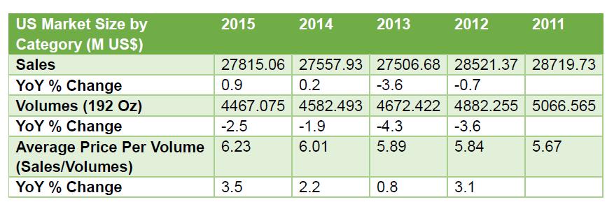 然而更重要的,是碳酸饮料市场市场已经开始萎缩了,IRI数据显示,碳酸饮料市场销售情况逐年萎缩。