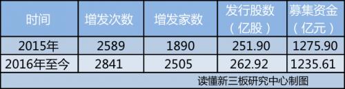 Choice数据显示,2015年全年完成的股票发行次数为2589次,发行股数为251.90亿股,融资金额为1275.90亿元;在挂牌公司数量大幅增加的情况下,实际募集资金相较于2015年却相差无几。