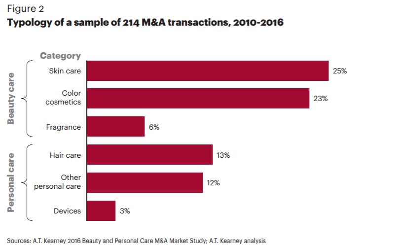 根据A.T.Kearney 发布的报告,2010年-2016年间共有214起美妆、个护行业并购交易。美国美妆及个护市场在过去五年仅增长 3%,美妆行业的有机增长正在放缓,并购对于很多美妆公司来说成为了上选。