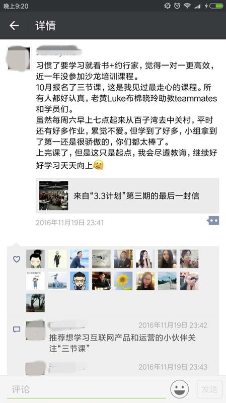 以及,我们在所有的课程的用户体验管理方面,也有自己的一套逻辑,我们会精细了每一个用户体验环节里去看、去思考,我们可以在运营层面做哪些事,来提供给用户超出他们预期的体验?按照这个思考和方法跑了一年,我们现在可以做到说,一堂课程结束后,大约百分之六七十的用户都会自发去发朋友圈,且发的内容都是像下面这种你看过后你都会经常觉得很感动的内容。