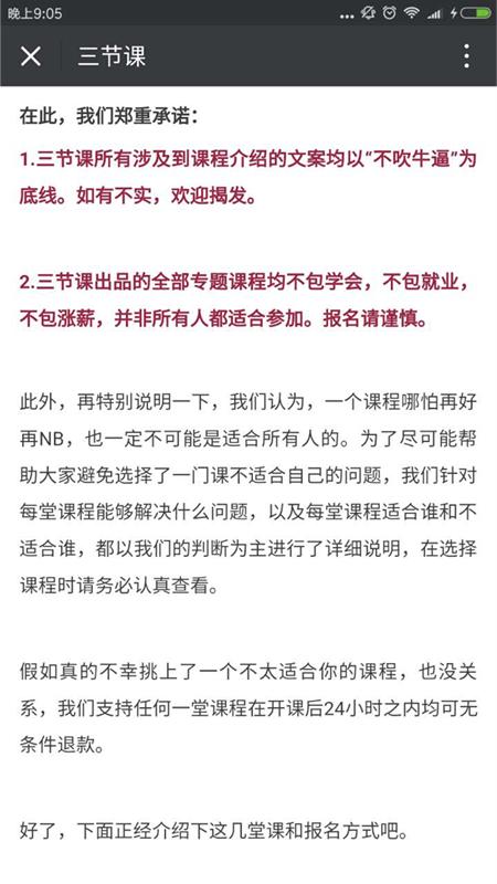 包括你可能从来没有看一个卖课程的机构会这样对外去宣传自己的课程——我们会跟大家讲三节课出品的全部课程均不包学会、不包就业、不包涨薪,不适合所有人参加,报名请谨慎。