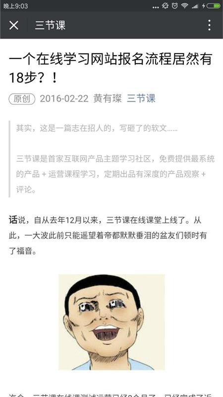 先说第一个和第二个事情,你会发现,我们往往会用很“自黑”的方式去跟用户沟通。比如说我们曾经发过这么一篇文章,说在三节课报名一堂课程需要18步操作,比如说,我们曾经做过一些活动很伤用户体验,我们也会坦诚出来道歉,我们会公开出来说:这个活动我们觉得我们做的烂透了。
