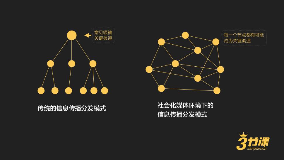这个事情没有互联网以前我们怎么做的?你发现没有互联网以前我们整个信息传播和分发的模式,它是一种完全取决于我们的关键核心节点。比如互联网出现之前我们想触达我们的用户影响我们的用户,最简单的方式就是上央视打广告,在地方权威媒体上面,报纸或者杂志上面投放广告,等等。