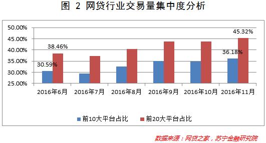 网贷之家数据显示,2016年1-11月,行业排名前10%的平台(200多家)交易量占比为85.64%,较2014年提升11个百分点。从排名前十的平台数据来看,交易量集中的趋势更为明显。2016年11月,行业前10大平台交易量为795亿元,占行业交易量的36.18%,较6月份提升5.59个百分点;前20大平台交易量为996亿元,占行业交易量的45.32%,较6月份提升6.85个百分点。从发展趋势来看,资金向头部平台集中的趋势仍然在进行中,且速度将越来越快。