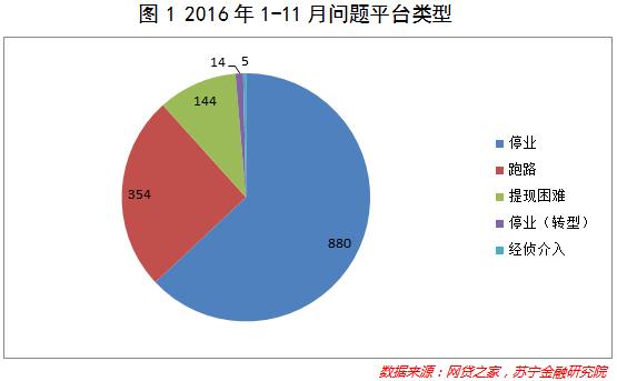 2016年1-11月,网贷行业累计出现问题平台1397家,其中,停业880家,占问题平台总数的63%;转型14家;剩余503家分别为跑路、提现困难和经侦介入,均直接影响到了投资者的资金安全。下半年以来,问题平台中主动停业的平台比例提升,而跑路平台比例则出现明显下降。