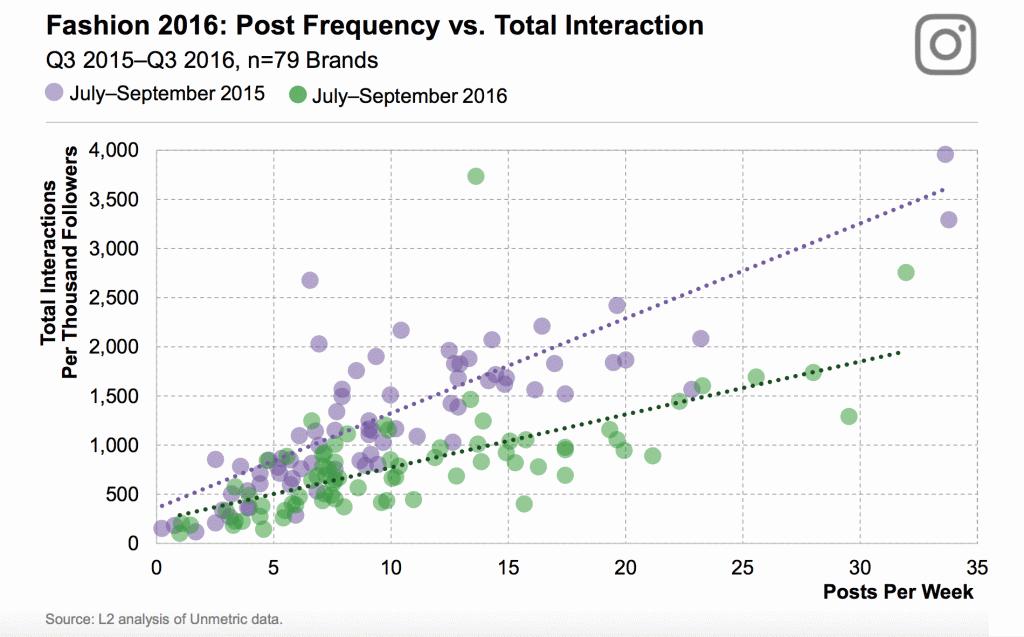 2015年和2016年第三季度:79个时尚品牌在 Instagram 的发帖频率和整体互动对比(图片来自华丽志)