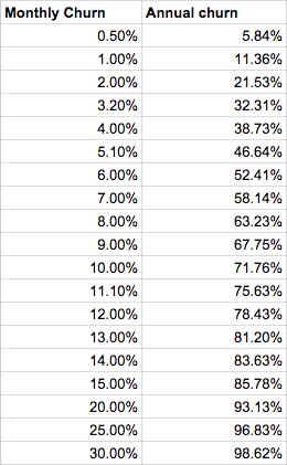 流失率,Churn也是重要的指标之一。通过下图可以清晰地看出每月流失率对全年流失客户的影响: