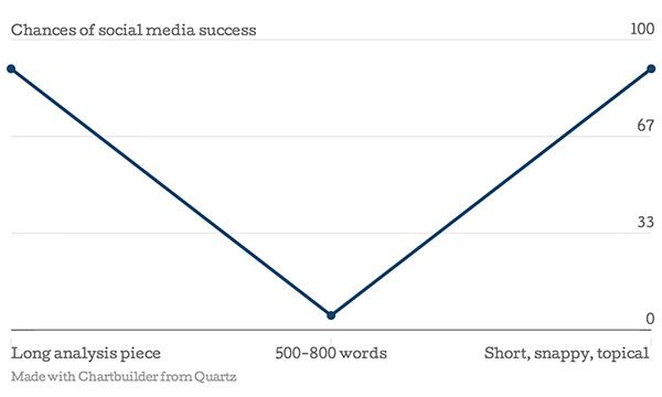 Quartz 主编 Kevin Delaney 似乎同意这个理论。2013年,他在一篇“每个人都知道大多数报道是700词的文章”中解释说, Quartz 上发表的文章通常在500词以下或大约1,200次,这儿有一张图: