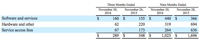 黑莓 2017 财年第三季度财报显示,截至 11 月 30 日,公司软件和服务业务营收为 1.60 亿美元,占总营收 2.89 亿美元的 55 %,比之上季度的 1.38 亿美元有 16 % 的增长。