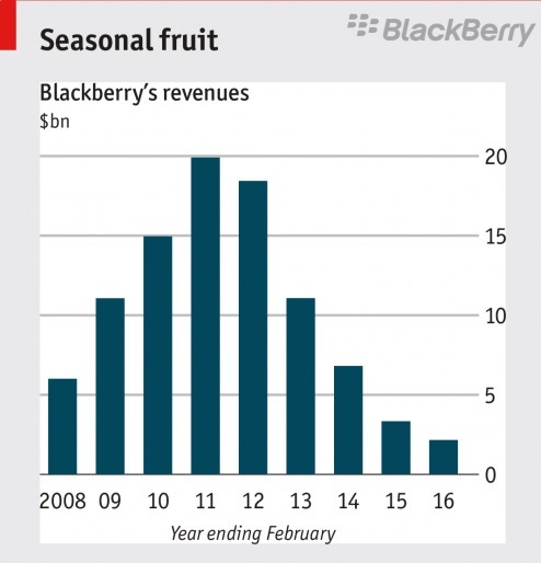 程守宗接棒三年以来,他曾多次重申如若手机业务部门赚不了钱,就将关闭。这也是迫于时局无奈的“声明”,但毕竟是昔日辉煌的手机业务,丢弃谈何容易。可是黑莓近几年的营收情况,自 2011 年黑莓营收攀至其巅峰后,接下来的颓势就再未扭转。