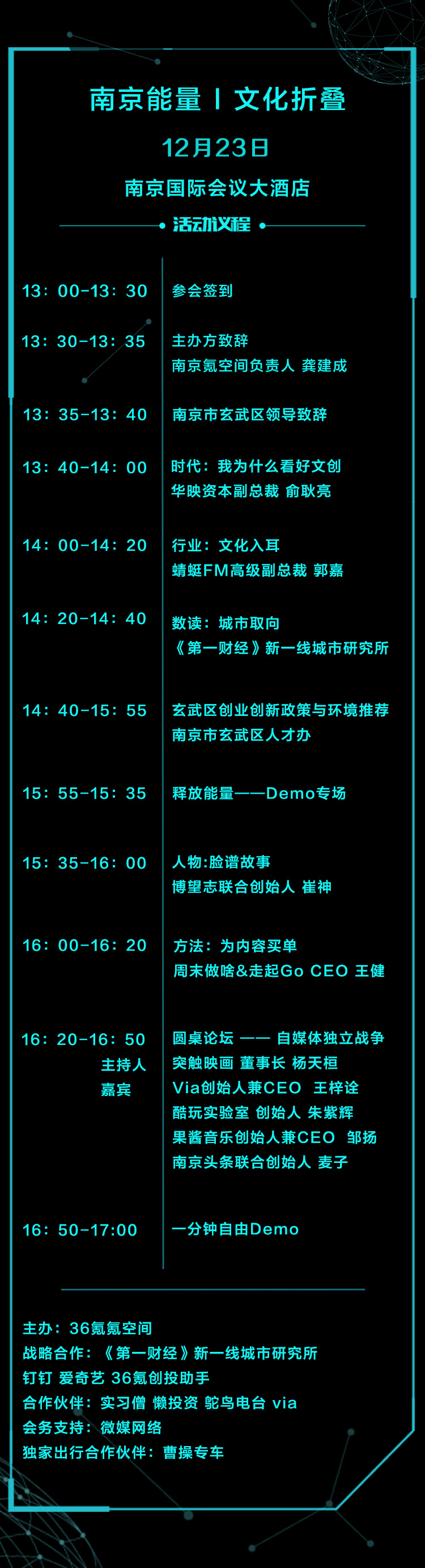 12月23日,氪空间开放日之南京能量,当古老的“金陵”遇上文化创业,让十位行业大咖从三大业务版块带你在文化折叠时代的媒体战争中步步为营。