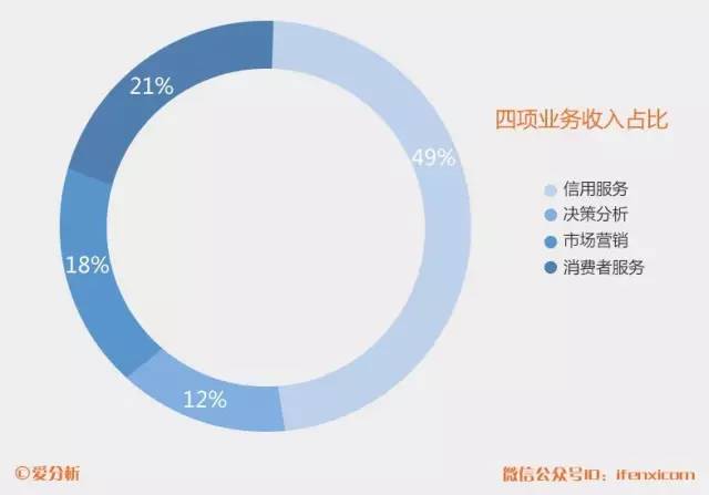 Experian的核心业务包括信用服务、决策分析、市场营销、消费者服务四个部分,其中前三个部分主要是面向机构提供服务,而消费者服务则是针对个人用户的。在其2015年收入中,信用服务收入占比49%,决策分析收入占比 12%,市场营销收入占比 18%,消费者服务占比21%。