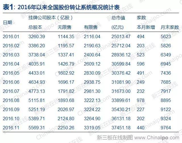 2016年全国股份转让系统新挂牌家数累计递增,到11月末,市场共计9764家,总市值与总股本持续增长,不断创造历史记录。截至12月20日,挂牌企业总数为10052家。