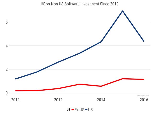 据 Crunchbase 的统计数据显示,美国市场对 SaaS 类创业公司的投资额从2010年的15亿美元增长到如今的70亿美元。2016年数据有所下降,这是因为大环境的变化以及今年还未结束,全年数据还没有完全统计出来。美国之外对SaaS行业的投资在同时间段内增长了6.3倍,对于SaaS行业的投资者们来说,这无疑是一个利好的消息。