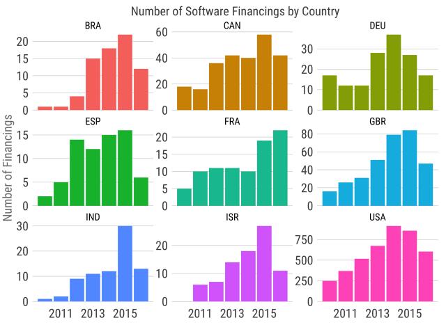 而这仅仅是 SaaS 类创业公司的开始,因为金融市场持续的增长以及对其产业的支持,2016注定是令投资者盆满钵盈的一年。毋庸置疑,美国依旧是软件市场的最大融资国。