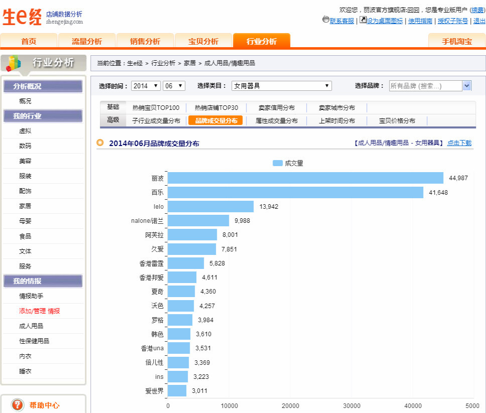 生e经统计的2014年6月情趣行业女用器具淘宝品牌成交量