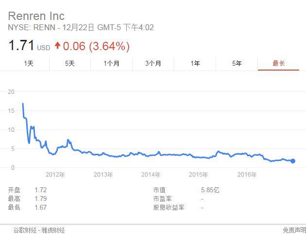 对于曾经风靡全国的校内人人,彼时风头无二。上市时市值最高达到76亿美元,然而据雅虎财经截止12月22日的数据,人人市值约为5.85亿美元,还不到市值高峰时的零头。这不经让人唏嘘不已。