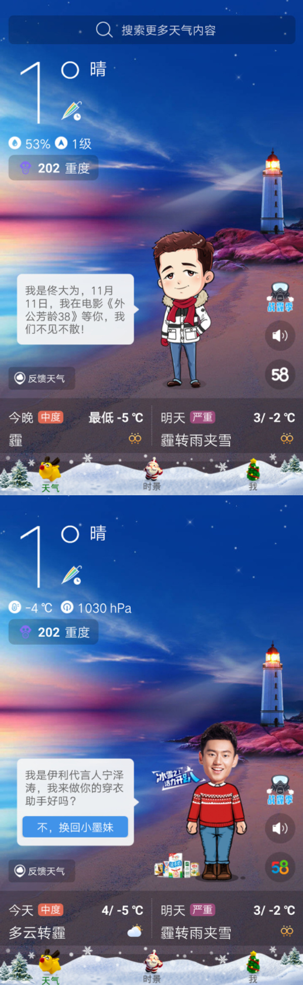 其中有一些有趣的尝试。以穿衣助手为例,这个小人的作用在于预报天气状况并给出相应的穿衣建议,墨迹让它成为了一个广告窗口。除了官方的四个人物,穿衣助手的身份设定还包括10个明星形象,衍生出大量跟明星绑定的商业广告。如设定为演员佟大为,助手则会提议观看他11月上映的电影《外公芳龄38》,如选定为游泳运动员宁泽涛,助手则会提示他是伊利代言人,通过点击人物可以跳转到伊利在优酷上的营销活动视频。