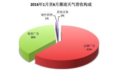 根据招股书,2016年前六个月,公司营业收入中品牌广告收入达到6535.83万元,占比61.29%,效果广告达到3989.44万元,占比37.41%,硬件销售达到121.02万元,占比1.13%,其他业务收入占比0.16%达到17.41万元。今年上半年总收入为1.07亿元,这个数字是2015年全年收入的86%。