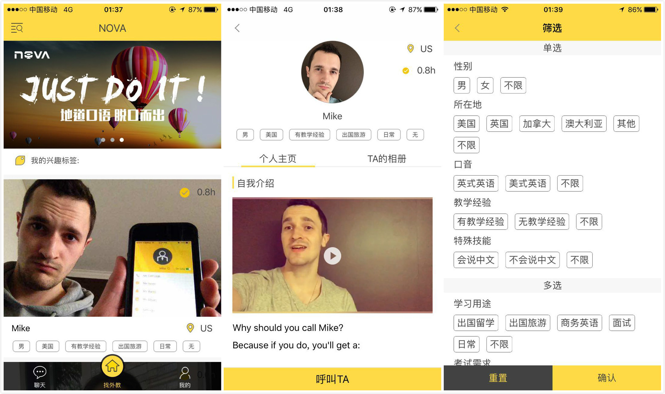 从美国留学回来的汤彦伟意识到,只有沉浸在英语的语言环境中才有可能真正练习好口语,于是创办了NOVA,希望能够能够让中国学生通过手机与在美国的外教视频语音互动,在形式上和 Cambly 有很高的相似度,但是在内容上类似 36 氪介绍过的面包英语,都比较注重实际应用。在汤彦伟看来,这个市场还远远没有打开。