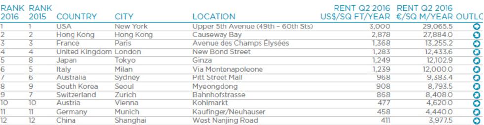 根据商业地产顾问公司 Cushman & Wakefield 发布的《2016-2017全球零售地产租金报告》,纽约第五大道,香港铜锣湾,巴黎香榭丽舍大街高居前三位,上海南京路也榜上有名。