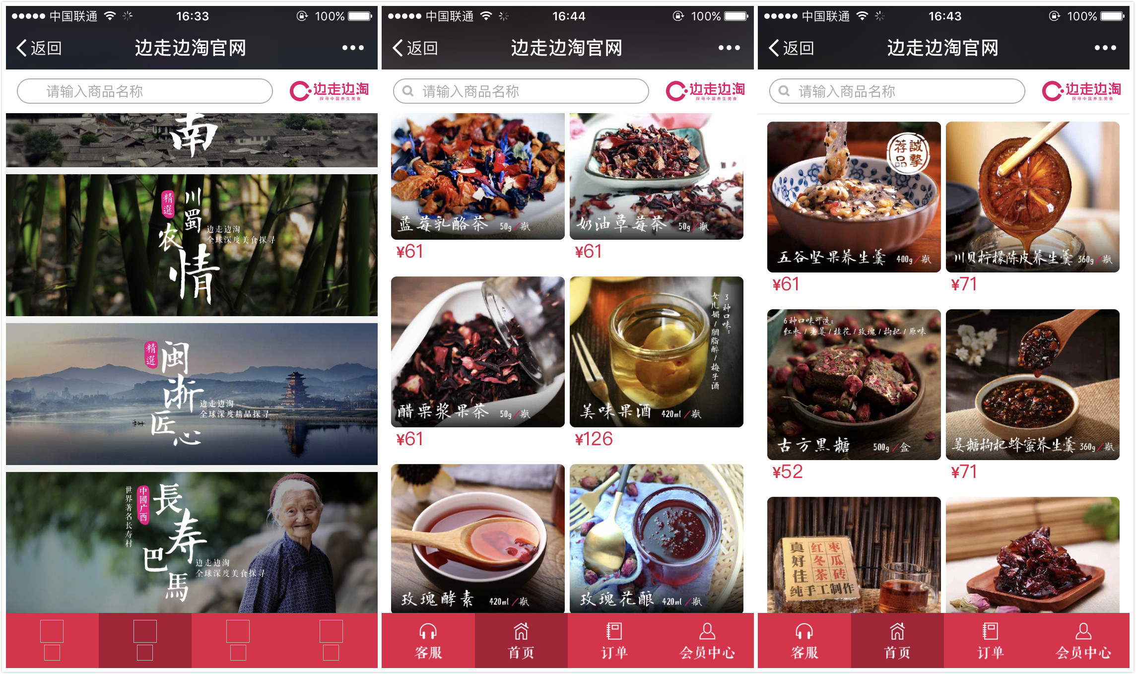 边走边淘的产品主打有故事、原生态和高性价比。在线上商城,他们把产品按云南、闽浙、川蜀等产地分类,对产地背后的故事进行挖掘。而从品类来看,产品分三类,一是准爆款,比如坚果羹;二是葡萄干、红枣、果酒等主流食品;三是销量少,但有特点的品类,比如长寿乡巴马火麻仁。目前平台上有 46 个 SKU,每周更新 2 个,提前一周准备 20 万元左右的仓储。
