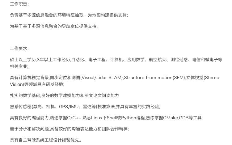 先说信息融合,自动驾驶中目前流行使用的传感器包括激光雷达、单目或双目摄像头、毫米波雷达、超声波雷达、GPS/IMU等。传感器将物理信息收集上来,再进行相应校对,校准了的信息才能再给到中央决策系统。在下面的信息融合算法工程师要求中,我们也看到了腾讯对传感器的要求,应聘者需要对传感器校准算法熟悉并有实践经验。