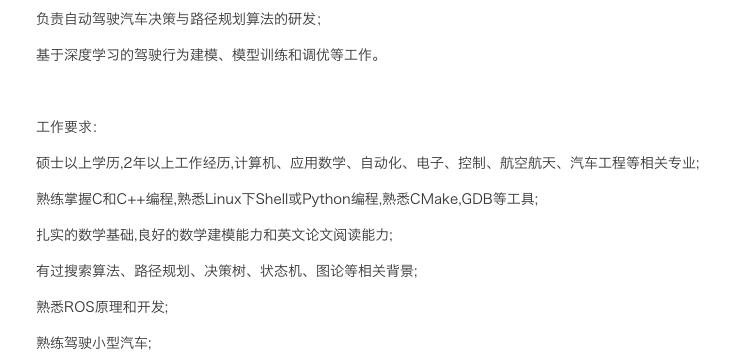 下面再说决策算法,在工作要求的第四行,我们能看到,腾讯要求有决策方面的经验,这包括搜索算法、路径规划(经过决策后走哪条路)、决策树、状态机、图论等。另外,有意思的是腾讯还要求应聘者需要能熟练驾驶小型汽车,这不难理解,信息从收集、处理到最终反馈到决策层面,一个直观体现就是,车辆在实际路面上的表现,遇到行人该怎么做?遇到堵车情况下旁边车突然并线该怎么做?遇到前方事故应如何避让?