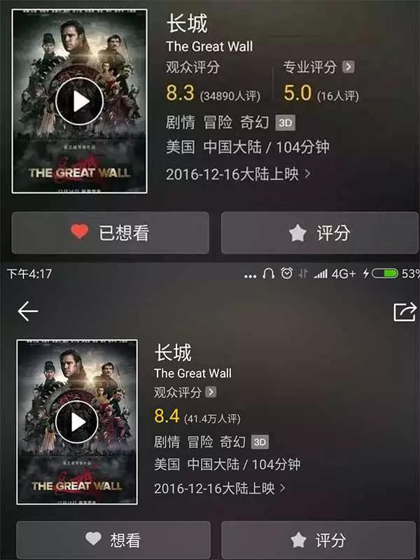 文章举例说,在猫眼平台40万观众给《长城》打了8.4的平均分,然而45位影评人给出的专业评分仅为4.9,《铁道飞虎》和《摆渡人》的观众打分和专业打分同样差异悬殊。