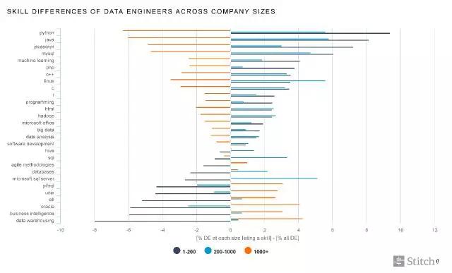 纵轴表示技能,横轴则表示相对偏差(Relative Difference:某一次测量的绝对偏差占平均值的百分比)。深蓝色、天蓝色、橘色分别代表三种公司规模:1-200人、200-1000人、1000人以上。越接近图表顶部,该技能越应用于较小的公司,反之,位于底部的技能更普遍地出现在 1000 人及以上的公司里。