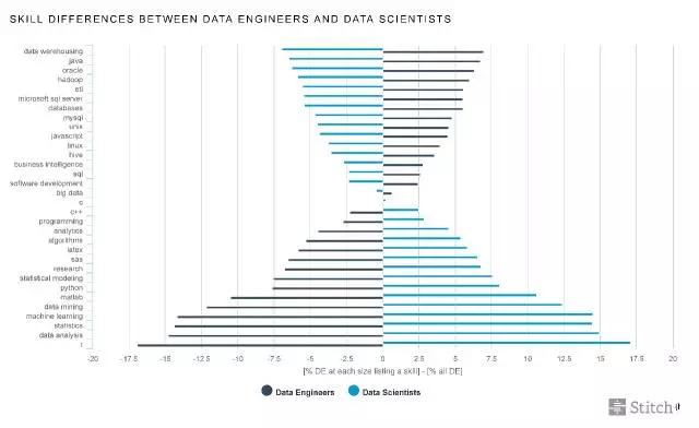 从图表的技能构成可以看出,数据工程师更倾向于掌握 “战术层面” 的具体数据技能,专注于使数据可用并能够在生产环境中对数据进行处理,如具体的编程语言、操作系统与数据库等;而数据科学家更倾向于“战略层面”的数据技能,如数据分析、数据挖掘、统计分析、机器学习等。