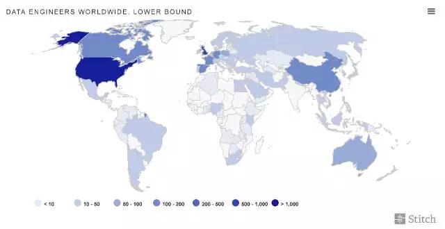 美国至今有着最多的数据工程师,也同样在全球有着最多的数据工程师档案:接近4倍多于排名第二的印度。