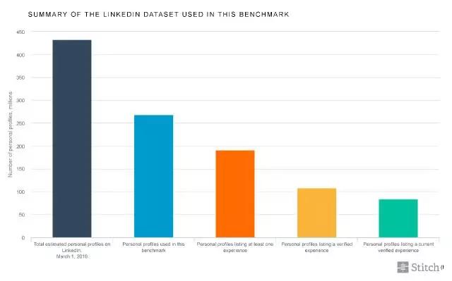 截止 2016 年 3 月 1 日,Linkedin 上的个人档案大约 4.3 亿,此次参考了 2.6 亿例档案,其中列有至少一项经历的近 1.9 亿, 有一项已认证经历的超过 1 亿,当前经历已认证的近 8000 多万。