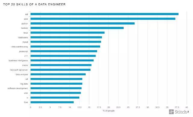 数据工程师前 5 项主要技能是:SQL, Java, Python, Hadoop, 和Linux。R语言甚至都没进前 20。