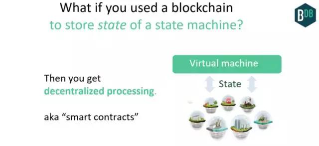 到目前为止,我们谈论了区块链作为去中心化数据库的内容。但我们也可以去中心化处理过程:基本上就是一个状态机的存储状态。周围有一些基础设施的话做起来更容易,而那就是「智能合同(smart contracts)」技术(比如 Ethereum)的本质。