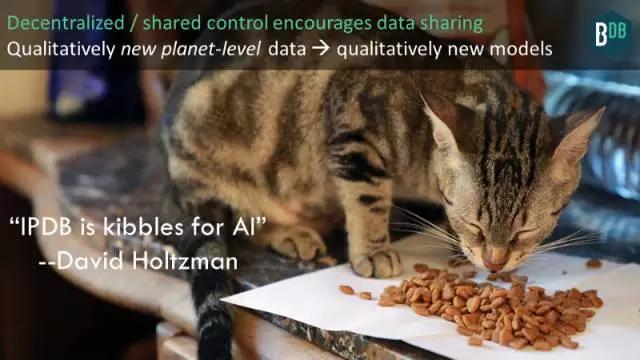 还会有一个 Bot 角度的。我们一直假定区块链 API 的主要消费者会是人类。但如果是机器呢?现代 DNS 的创造者 David Holtzman 最近说,「IPDB 是人工智能的饲料(kibbles)」。分析一下,这是由于 IPDB 实现并鼓励了行星层次的数据共享,而人工智能实在是很喜欢吃数据。