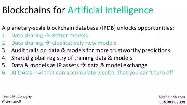 区块链技术同样能够变革人工智能——当然以它自己的特定方式进行。部分将区块链用于人工智能方式目前还很单一,比如在人工智能模型上进行审计跟踪(audit trail)。有些应用几乎是难以置信的,比如拥有自己的人工智能——人工智能去中心化自治组织(AI DAO)。这些都是发展的机会。这篇文章将具体探讨这些应用。